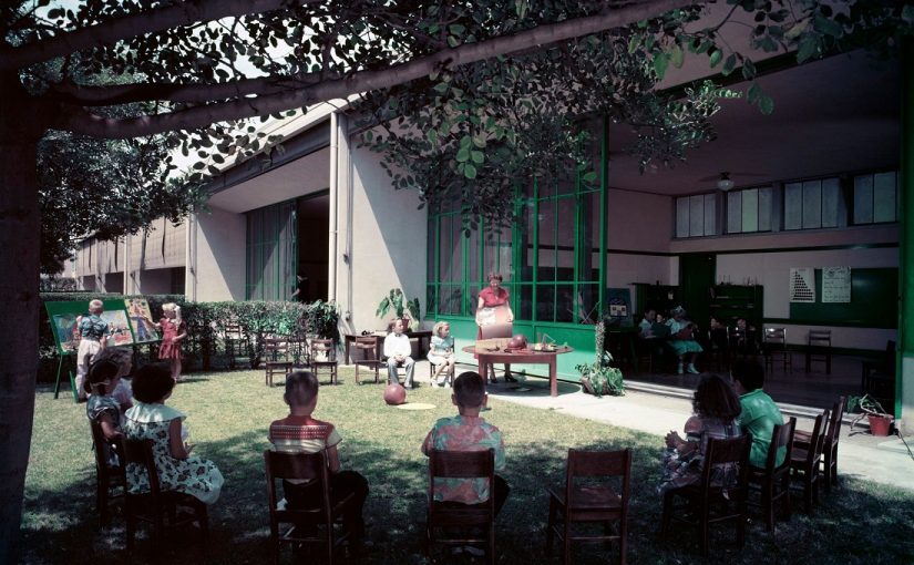 Bild: Los Angeles, Corona Avenue School (Richard Neutra, 1953), Klassenzimmer im Freien (Foto: Julius Shulman, 1953, Bild: © J. Paul Getty Trust. Getty Research Institute, Los Angeles (2004.R.10)).