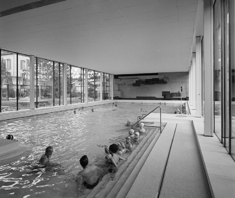 Bild: Baden/Aargau, Thermalschwimmbad, Otto Glaus, 1963–1969, abgerissen 2017 (Foto: Comet Photo AG, Zürich, 1969, Bild: © ETH-Bibliothek Zürich, Com_M18-0023-0002-0009, CC BY-SA 4.0).
